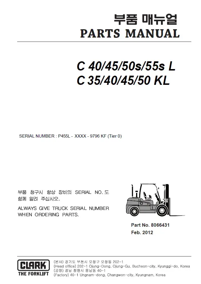Clark Forklift C 40/ 45/ 50s/ 55s L, C 35/ 40/ 45/ 50 KL Parts Manual