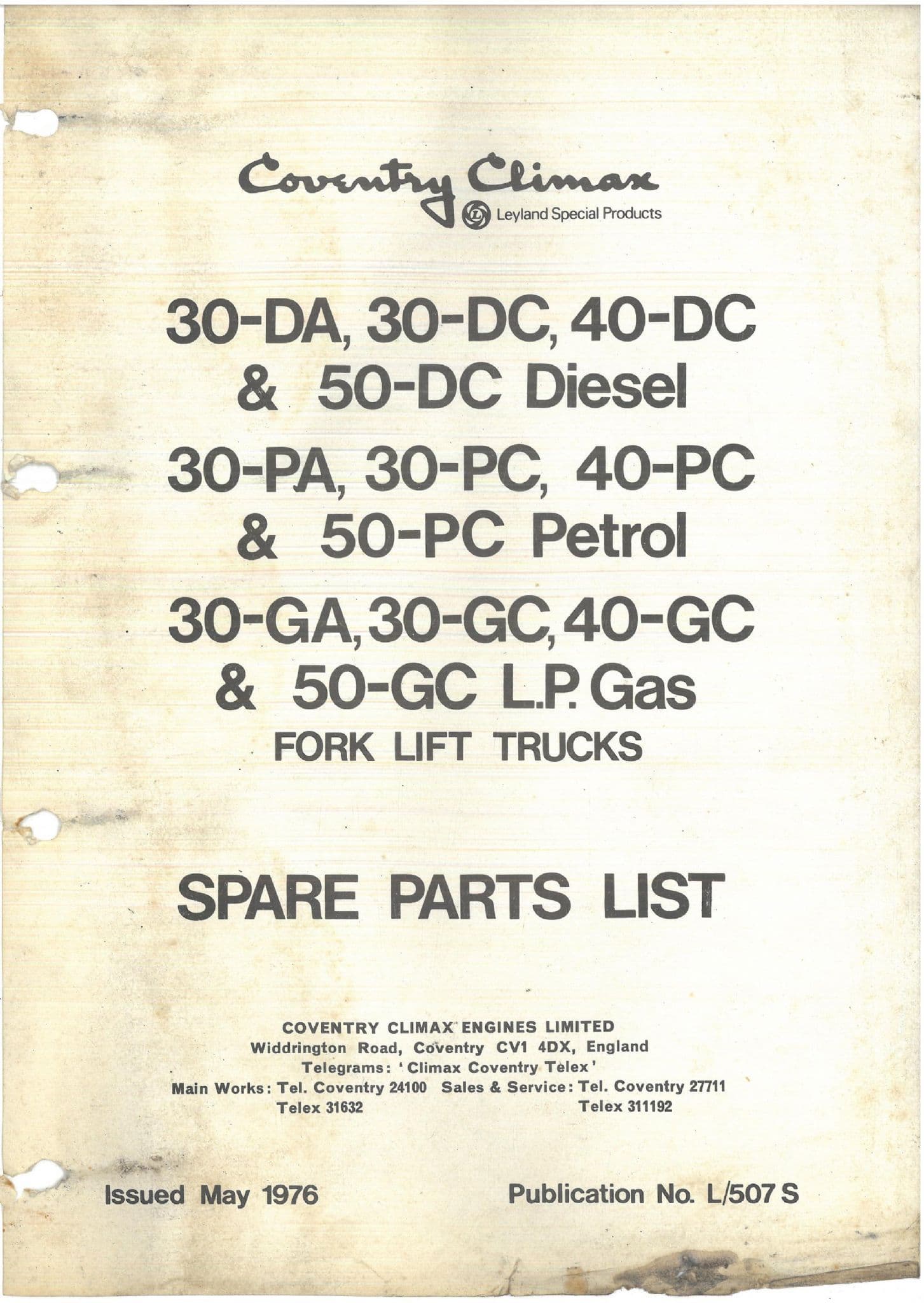 Coventry Climax Forklift Truck 30DA 30DC 40DC 50DC 30PA 30PC 40PC Diesel Petrol LP Gas Parts Manual