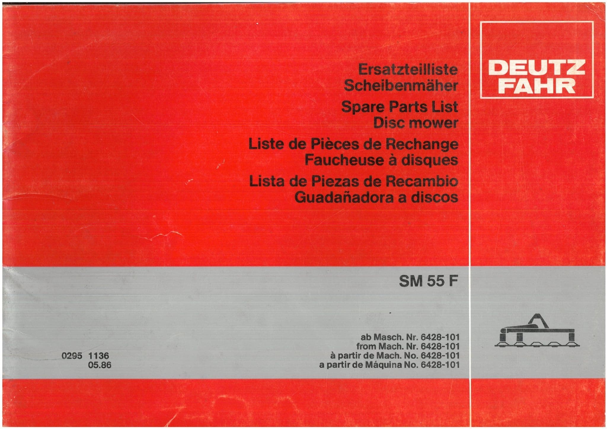 Mower & Topper Manuals Home / Implements Manuals / Hay & Forage Equipment Manuals / Mower & Topper Manuals / Deutz Fahr Disc Mower SM55F Parts Manual Deutz Fahr Disc Mower SM55F Parts Manual Deutz Fahr Disc Mower SM55F Parts Manual £16.99 Stock Status: In Stock Add to your Wish List Information Specifications Reviews ILLUSTRATED PARTS MANUAL WITH EXPLODED DIAGRAMS SHOWING VARIOUS COMPONENTS OF THE MACHINE, PARTS DESCRIPTIONS AND PARTS NUMBERS A REPRODUCTION OF THE ORIGINAL MANUAL CLICK ON THE IMAGE FOR AN ENLARGEMENT Store Ref - BX6 Product Code: BX6 Weight: 0.3kg Customer reviews No reviews left yet Write A Review Most RecentTop Rated No reviews have been left for this product, be the first to leave a review