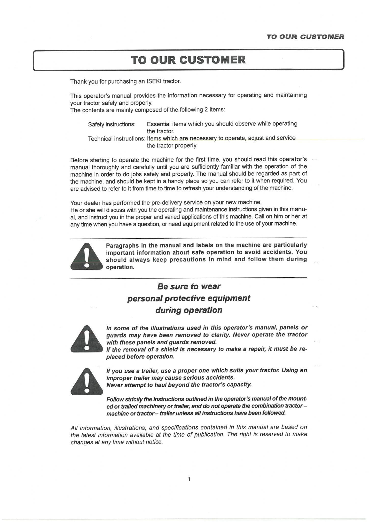 THIS OPERATORS MANUAL GIVES INFORMATION ON THE OPERATION, THE LUBRICATION, MAINTENANCE AND SAFETY ASPECTS