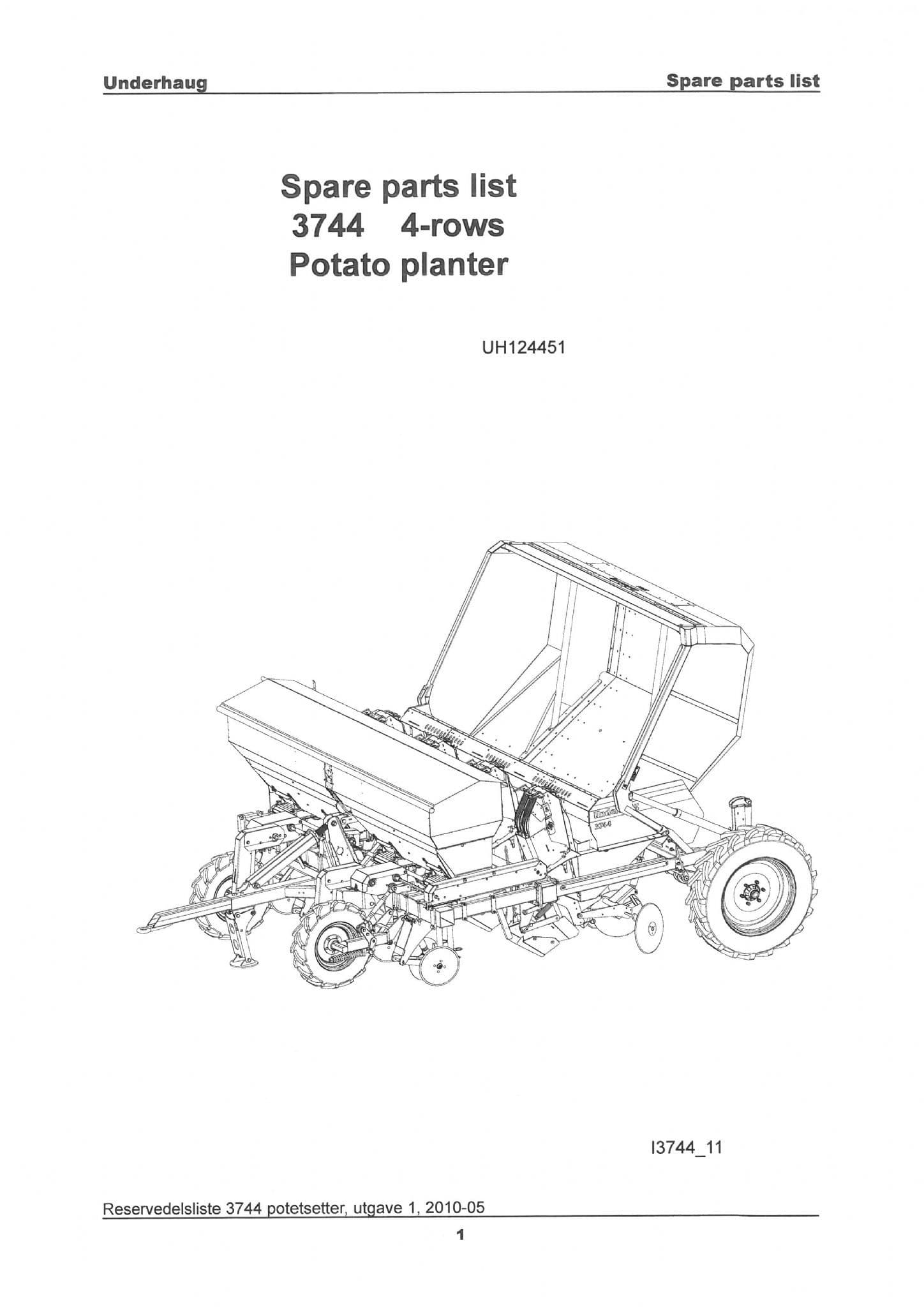Kverneland Underhaug Four Row Potato Planter 3744 Parts Manual