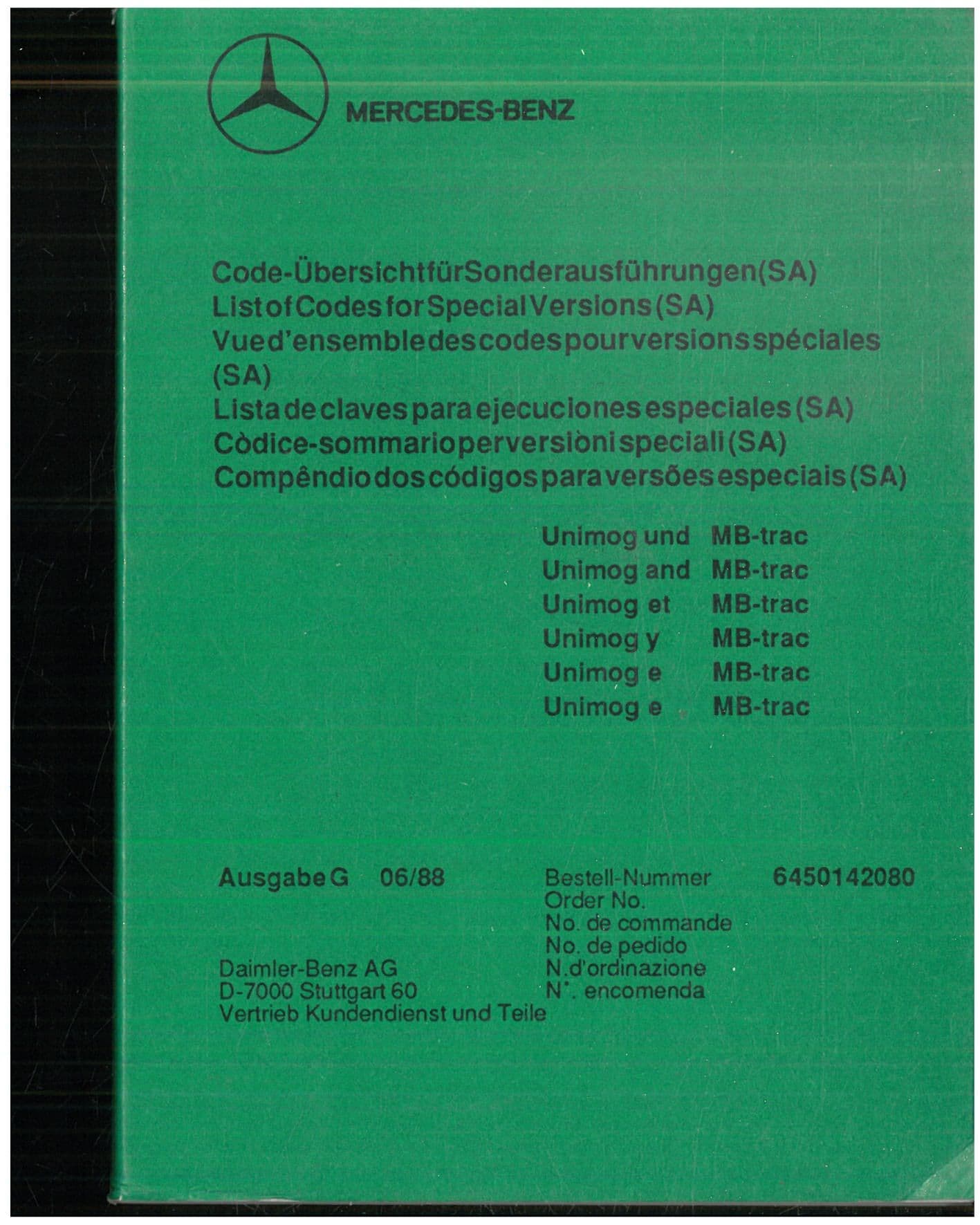 German Tractor Brochures Home / Brochures & Sales Literature / Tractors / Other Tractors / European Tractors / German Tractor Brochures / Mercedes Benz MB Trac & Unimog List of Codes for Special Versions Pocket Book Mercedes Benz MB Trac & Unimog List of Codes for Special Versions Pocket Book Mercedes Benz MB Trac & Unimog List of Codes for Special Versions Pocket Book £9.99 Stock Status: In Stock Add to your Wish List Information Specifications Reviews 168 POCKET BOOKLET WHICH SHOWS LIST OF CODES THAT HAVE BEEN COMPILED FOR FINDING THE MEANING AND DESCRIPTION OF THE SPECIL VERSIONS CORRESPONDING TO THE CODE DESIGNATIONS AS GIVEN ON VEHICLE DATA CARDS AN ORIGINAL BOOKLET IN GOOD CONDITION Store Ref – CAB2-DR3 Product Code: CAB2-DR3 Weight: 0.2kg Customer reviews No reviews left yet Write A Review Most RecentTop Rated No reviews have been left for this product, be the first to leave a review