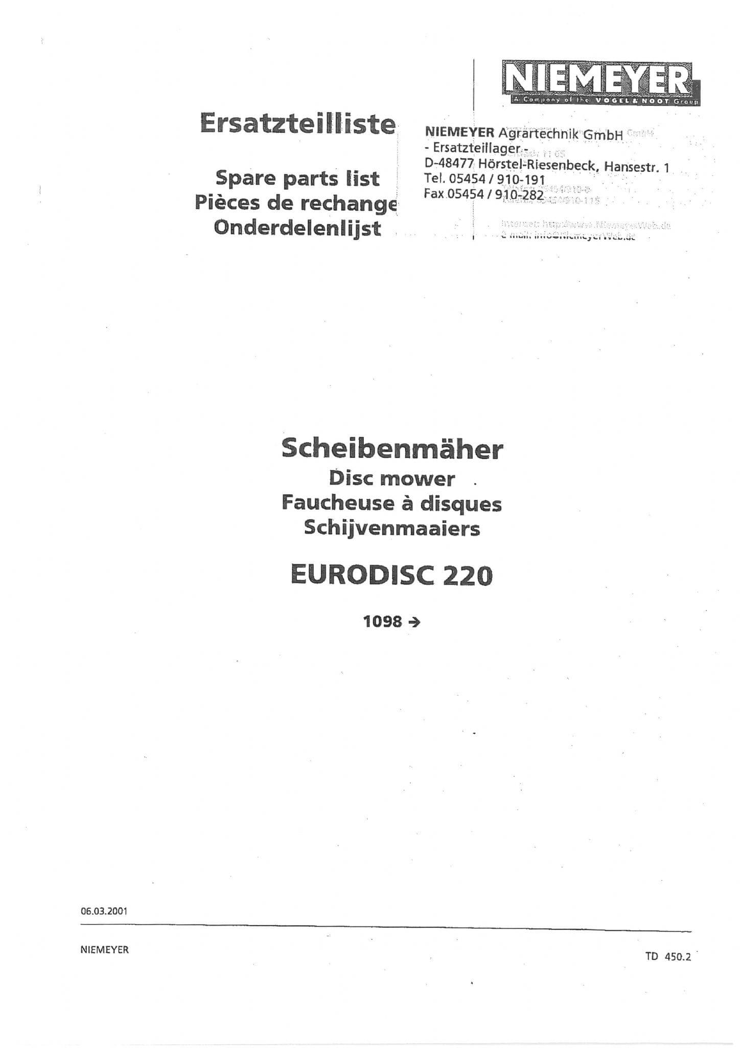 Niemeyer Disc Mower Eurodisc 220 Parts Manual