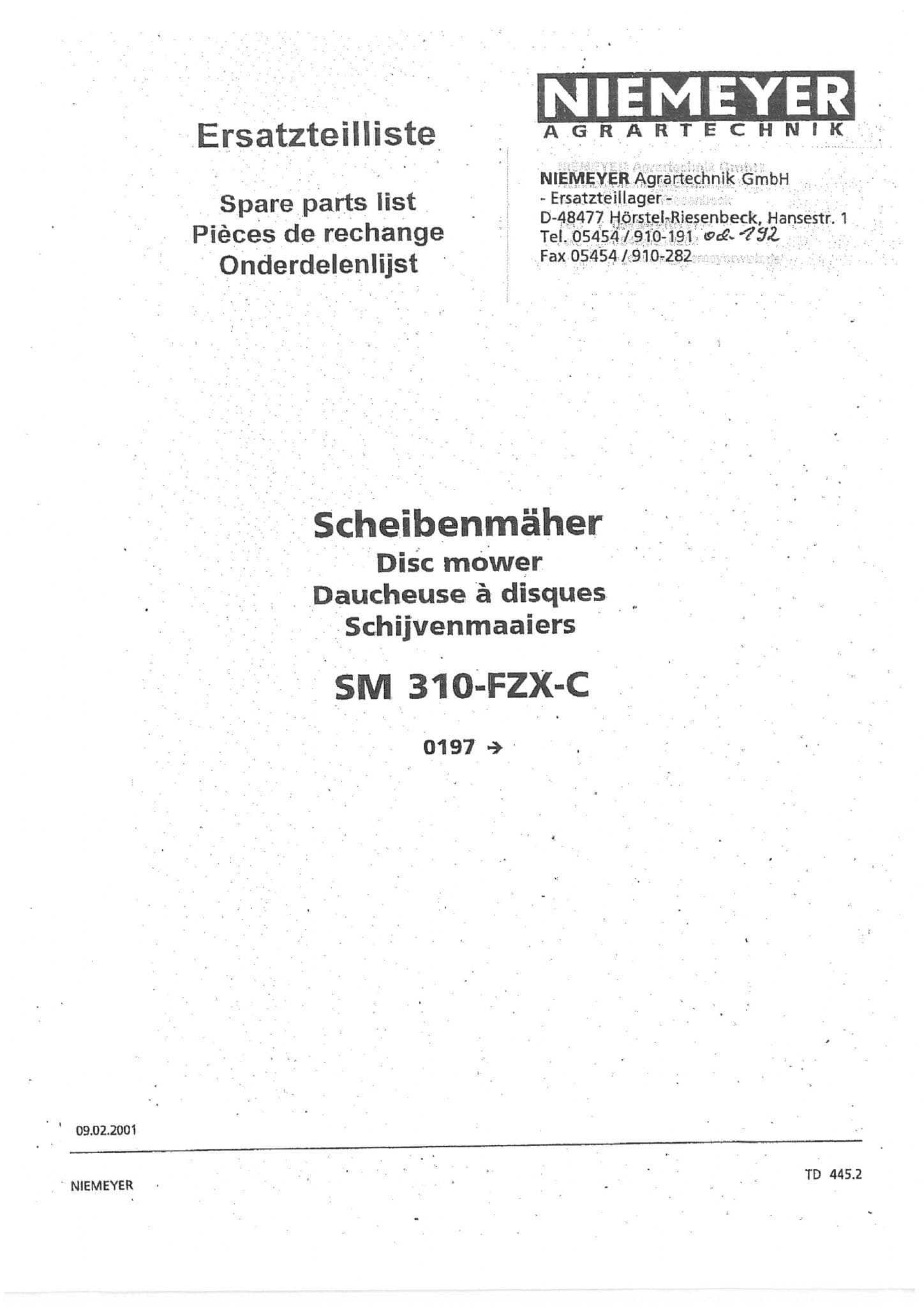 Niemeyer Disc Mower SM310FZXC Parts Manual
