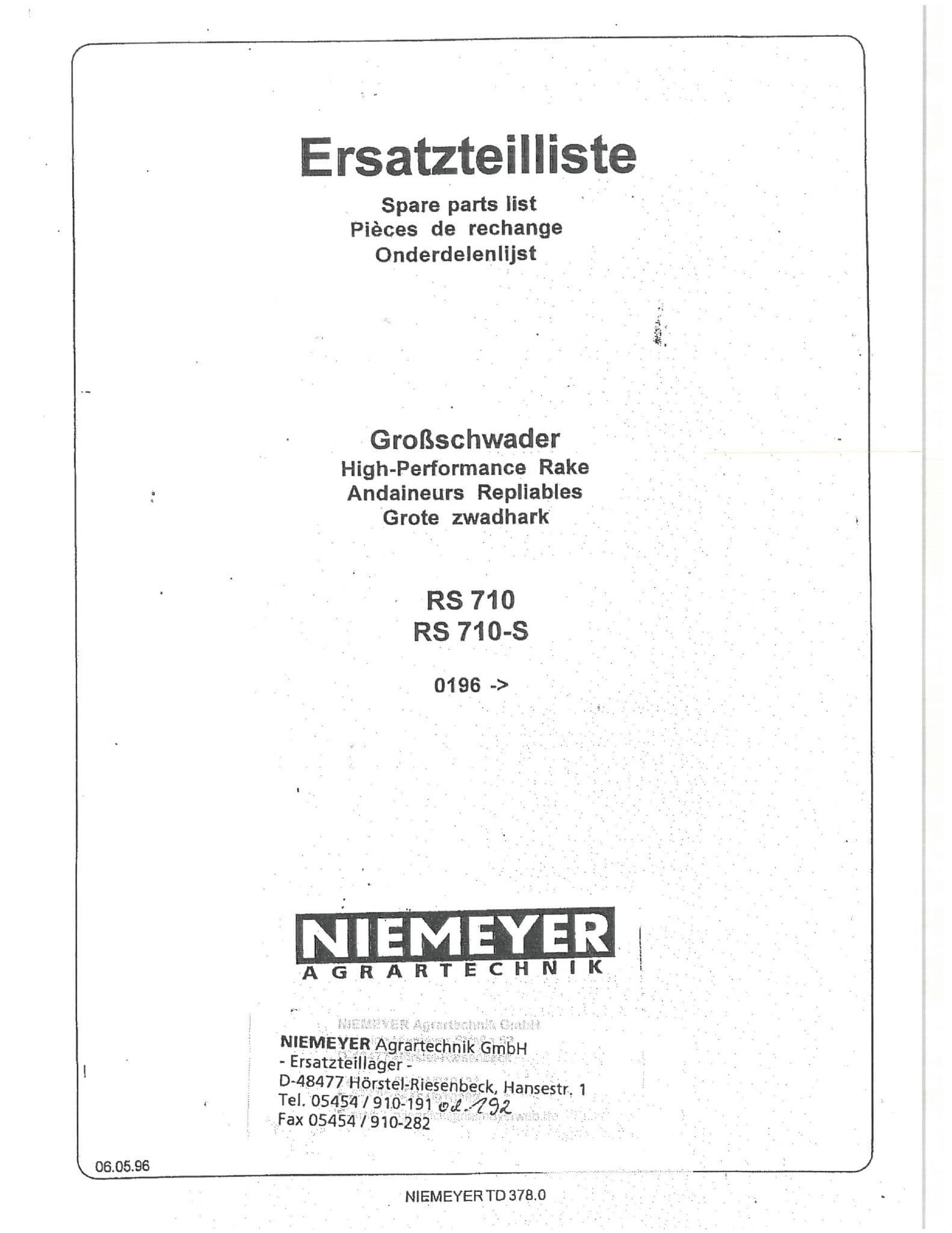 Niemeyer High Performance Rotary Rake RS710 RS710S Parts Manual