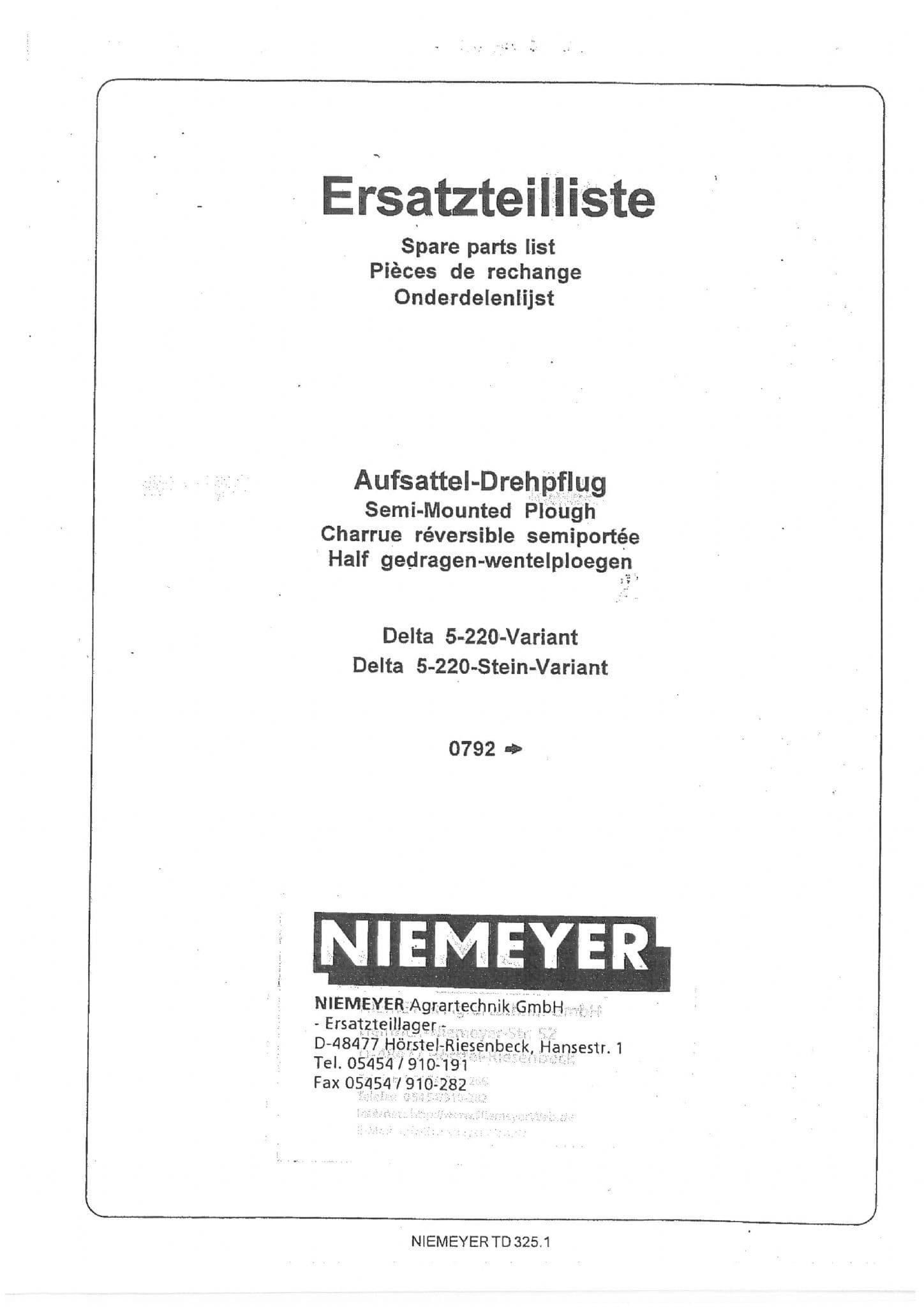 Niemeyer Reversible Plough Delta 5-220 Variant Parts Manual